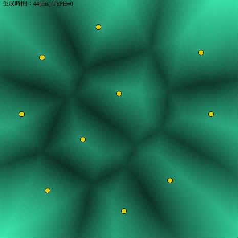 ボロノイ図からの派生によるテクスチャ生成の実験 制御点をドラッグで移動 カーソルキー上下で生成タイプ変更