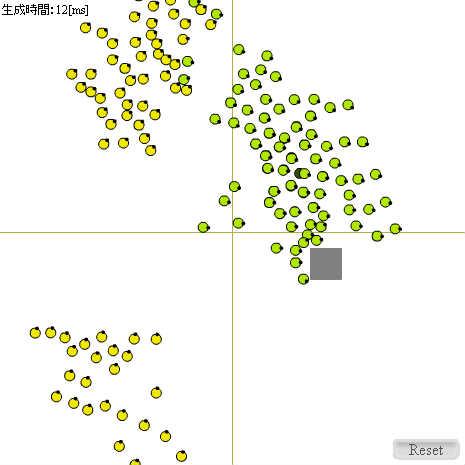 バタフライ効果の実験 クリックで一番近い人の位置に干渉 干渉しなかったときの挙動を暗い色で表示 もっと緩やかに崩壊していくものかと思ってたらそうでもなかった・・・