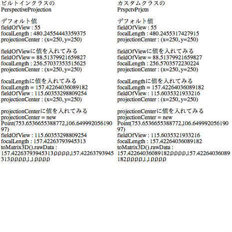 PerspectiveProjectionと 同じ計算をするクラスを作るとしたら こんなかんじかな。 値がぴったり一致しないのは、 ビルトインクラス側では三角関数をMathではなく、 別なものから求めているからなんじゃないかな、、、。