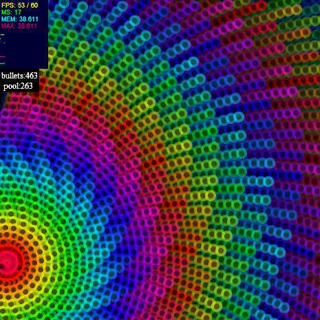コードのリファクタリング & 最適化 Nicolasが最適化してくれました。 http://wonderfl.net/code/63f88f2189846bdc7275a01d5d228b1607344e51 BitmapData#draw() を BitmapData#coloyPixces() に変えるだけ! めっちゃ早いよ!これ! by coppieee さらに最適化! http://wonderfl.net/code/9dcd5e428a43c4b20f69f86873f2831fa9ec32f3 に触発されて、私も最適化してみた。Linked listは使いたくなかったので別の方法で。 これでもか!ってぐらいがんばった。 Particleのプール用意して、 削除のところ工夫して、 回転の計算のアルゴリズム変更して、 とかもろもろ。 弾の大きさを変更したのはオマケ。(オマケなんだけど、小さければ小さいほど速くなるよ。) きっとこれ以上の最適化は無理だと思うよ! _canvas.copyPixels()のところを別の描画のアルゴリズムで置き換えたら、あるいはもっと速く・・・。 by coppieee 凝視注意