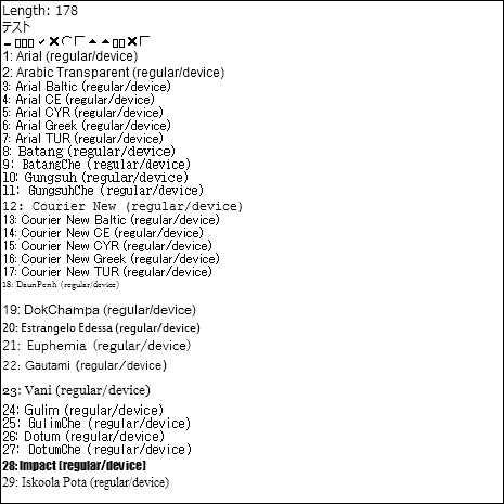 txf.appendText(i.toString() + ": " + f.fontName + " (" + f.fontStyle + "/" + f.fontType + ")\n");