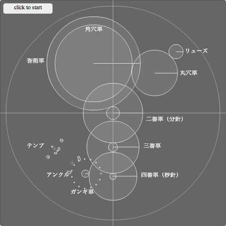 Mechanical Clock with Box2D(機械式時計) 最初はぜんまいが巻かれていない状態です。 左上のボタンをクリックすると最初の数秒間リューズにトルクを加え、ぜんまいが巻かれ、時計が動き始めます。 途中から、30秒間で秒針(四番車)が何度回転するかを計測します。 http://flashjp.com/mecclock