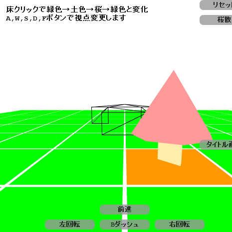 桜の散るイメージをパーティクルで作ってみました パーティクル花が桜より高い位置から散りますが。。。 ランド画面でPlaneオブジェクトでできた緑色の床をクリックすると以下のように変化します 緑色→土色→土色+桜→緑色と遷移します 「リセット」ボタンで床を初期化(全ての床を緑色の床に戻します) ランド画面でのカメラ視点移動 Wボタンでカメラ視点上移動 Sボタンでカメラ視点下移動 Aボタンでカメラ視点が操作矢印を中心に左周り Dボタンでカメラ視点が操作矢印を中心に右周り Fボタンでカメラ距離変更 タイトル画面に一度戻ってからランド画面再表示で操作矢印とカメラ視点を初期化 「桜散」ボタンで桜の花にみたてたパーティクルが散り(落ち)ます 桜散る機能を作るにあたって以下コードを参考にさせてもらいました http://wonderfl.net/code/fa14f82a17661da28ba550cc3f0e046d729ad3c9 http://wonderfl.net/code/7141ada6db5172f8f7c70e7e07f6fe9231d80b7a