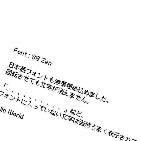 tx2.text = "Font : 88 Zen\n\n日本語フォントも無事埋め込めました。\n回転させても文字が消えません。\n\n「朧、卍、犧、巛、个、嚶、网、挈、儁、潺、鼈」など、\nフォントに入っていない文字は当然うまく表示されていません。\n\nHello World\n";