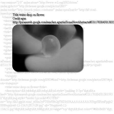 確認用URL http://photos.googleapis.com/data/feed/base/all?alt=rss&kind=photo&q=waterdrop&imglic=commercial&max-results=3&imgmax=288 ↑これをブラウザのURL欄にコピー&ペースト 【参考】Picasa Web Albums Data API http://code.google.com/intl/ja/apis/picasaweb/docs/2.0/reference.html