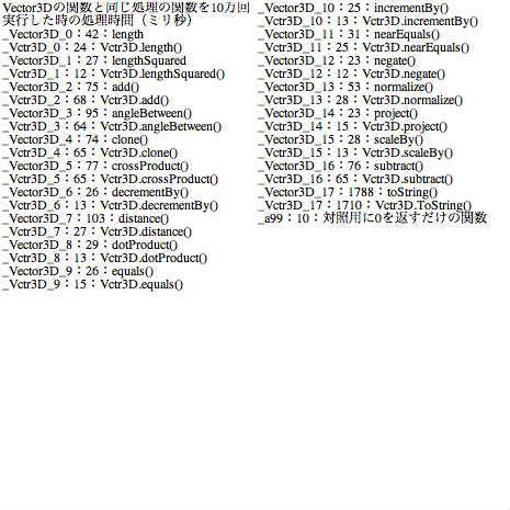 Vector3Dの関数と同じ処理の関数を10万回実行した時の処理時間(ミリ秒)