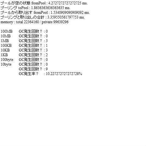 str += "プーリングと取り出しの合計 : " + (tests[0].timeAverage + tests[1].timeAverage) + " ms.\n";