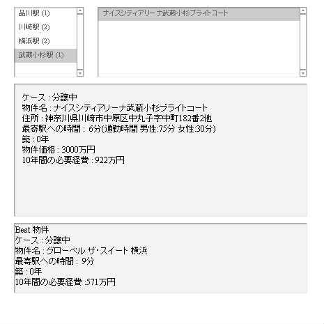 tf3.text = tf.text = "Best 物件\nケース : "+C+"\n物件名 : "+d[0].name+"\n最寄駅への時間 : "+d[0].walk+"分\n築 : "+d[0].old+"年\n10年間の必要経費 :"+Math.floor(best_price / 10000)+"万円";
