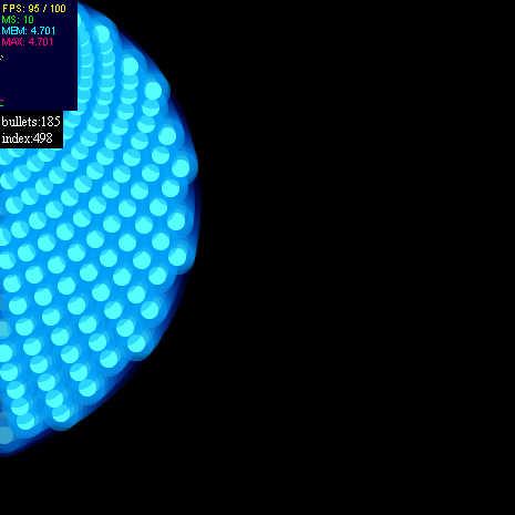changed: -> 効果測定用に100fpsにしました。 -> enterFrame内でのnewと定数の再計算を減らしました。 -> vectorをやめて双方向連結リストにしました。 -> http://wonderfl.net/code/dd96bd457071a86d4406a8019aa01ef0f773abf8 上記URLの挙動計算アルゴリズム改善を移植させて頂きました。 -> particlesを初期化以降はnewしなくていいように配列で準備してみましたが こちらは目に見える効果がありませんでした。 メソッド呼び出し分のオーバヘッド+中身の処理でトントンぐらいなんでしょうか。 particlesがもっと大きい構造体になれば効果が現れるのかな? comment: forkの使い方を間違えました。すみません。 null参照や無限ループでブラウザを落としてしまう時間がありました。 申し訳ありません。 なんかインデントが無茶苦茶になってしまいました。 EDITフィールドから見ると正常なのですが・・・ todo: コードのリファクタリング & 最適化 Nicolasが最適化してくれました。 http://wonderfl.net/code/63f88f2189846bdc7275a01d5d228b1607344e51 BitmapData#draw() を BitmapData#coloyPixces() に変えるだけ! めっちゃ早いよ!これ!