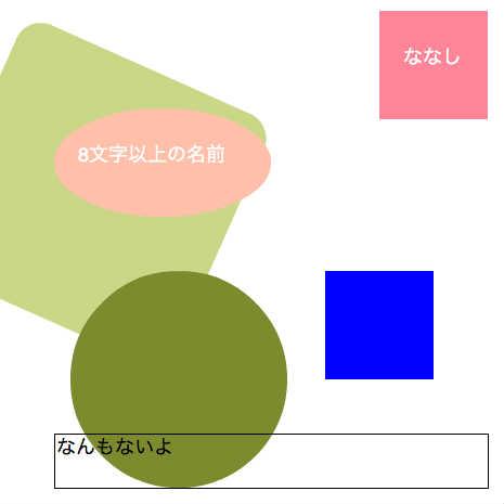 stage.addChild(MakeUI.newSprite([50, 100], [["name", "サーモンピンクの楕円"]], [["beginFill", [0xFFC0A9, 1]], ["drawEllipse", [0, 0, 200, 100]]],MakeUI.newTextField([20,30,200,null,"8文字以上の名前",0xFFFFFF],[["name","12345678"],["selectable",false]])));