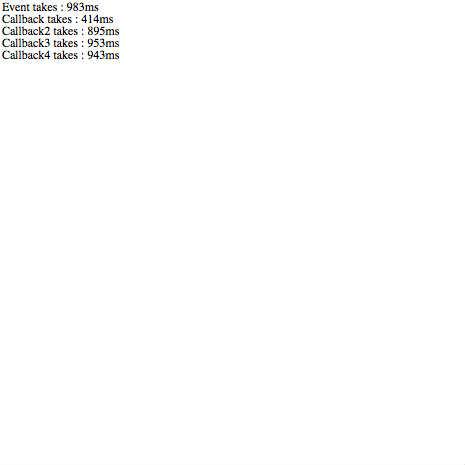 Dispatch される側の検証。 Event : いつもどおりのEventの計測 Callback : いつもどおりのCallbackの計測 Callback2 : type のみを実装した CallbackObject クラスをディスパッチ Callback3 : CallbackObject2 に Event と同等のプロパティを実装し、ディスパッチ Callback4 : CallbackObject3 に Event と同等のプロパティと関数を実装し、ディスパッチ