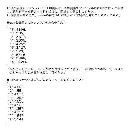 text += '10個の要素にシャッフルを1000回試行して各要素がシャッフルされた配列のどの位置にいるかを平均するメソッドを追加し、理論的にテストしてみた。\n';