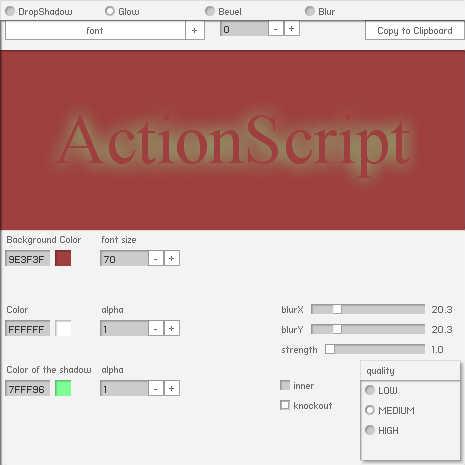 var str:String = "new GlowFilter(0x" + scc.value.toString(16).toUpperCase() + "," + stepper2.value.toFixed(1) + "," + blurX.value + "," + blurY.value + "," + strength.value + "," + q + "," + inner.selected + "," + knockout.selected + ")";
