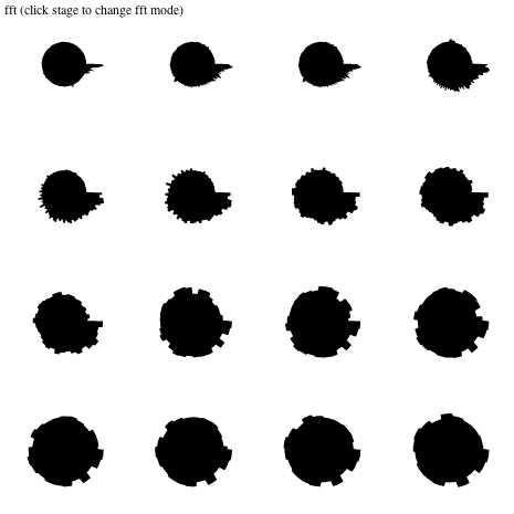 SoundMixer.computeSpectrum の第3引数 stretchFactor * による波形への影響を調べています * * stretchFactor = * 0 1 2 3 * 4 5 6 7 * 8 9 10 11 * 12 13 14 15 * * インタラクションはステージ上クリックによるFFTModeの切り替えのみ * * computeSpectrumメソッドを使っているため、 * Youtubeやニコニコ動画が裏で流れていると失敗します