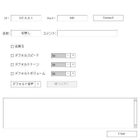 voice:声質(0:棒読みちゃん画面上の設定、1:女性1、2:女性2、3:男性1、4:男性2、5:中性、6:ロボット、7:機械1、8:機械2、10001~:SAPI5)