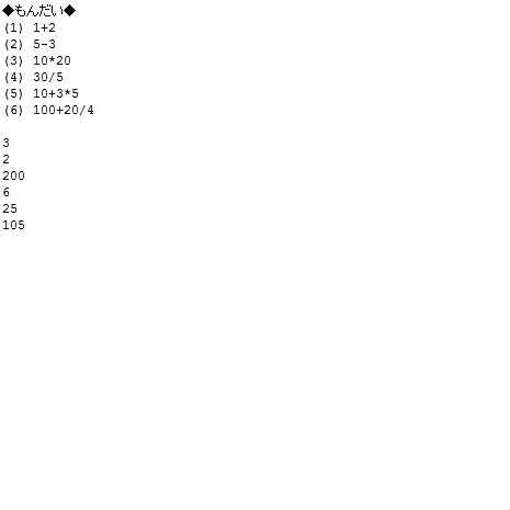 trace("◆もんだい◆\n(1) 1+2\n(2) 5-3\n(3) 10*20");