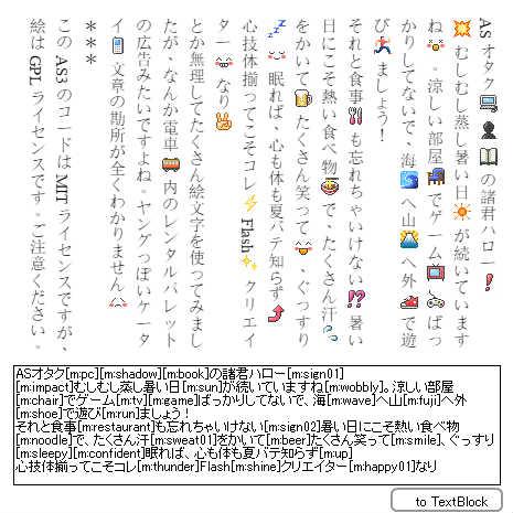 inputTF.text = "ASオタク[m:pc][m:shadow][m:book]の諸君ハロー[m:sign01]\n[m:impact]むしむし蒸し暑い日[m:sun]が続いていますね[m:wobbly]。涼しい部屋[m:chair]でゲーム[m:tv][m:game]ばっかりしてないで、海[m:wave]へ山[m:fuji]へ外[m:shoe]で遊び[m:run]ましょう!\nそれと食事[m:restaurant]も忘れちゃいけない[m:sign02]暑い日にこそ熱い食べ物[m:noodle]で、たくさん汗[m:sweat01]をかいて[m:beer]たくさん笑って[m:smile]、ぐっすり[m:sleepy][m:confident]眠れば、心も体も夏バテ知らず[m:up]\n心技体揃ってこそコレ[m:thunder]Flash[m:shine]クリエイター[m:happy01]なり[m:scissors]\nとか無理してたくさん絵文字を使ってみましたが、なんか電車[m:train]内のレンタルパレットの広告みたいですよね。ヤングっぽいケータイ[m:mobilephone]文章の勘所が全くわかりません[m:shock]\n***\nこのAS3のコードはMITライセンスですが、絵はGPLライセンスです。ご注意ください。";