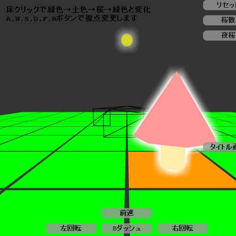 夜桜イメージをGlowFilterを使用して表現してみました ランド画面でPlaneオブジェクトでできた緑色の床をクリックすると以下のように変化します 緑色→土色→土色+桜→緑色と遷移します 「リセット」ボタンで床を初期化(全ての床を緑色の床に戻します) 「桜散」ボタンで桜の花にみたてたパーティクルが散り(落ち)ます 「夜桜」ボタンでGlowFilterの効果で桜と月が光ります ランド画面でのカメラ視点移動 Wボタンでカメラ視点上移動 Sボタンでカメラ視点下移動 Aボタンでカメラ視点が操作矢印を中心に左周り Dボタンでカメラ視点が操作矢印を中心に右周り Fボタンでカメラ距離変更 Rボタンでカメラの初期化(カメラの距離と高さを初期状態に設定&カメラ視点を操作矢印の真後ろに設定) タイトル画面に一度戻ってからランド画面再表示で操作矢印とカメラ視点を初期化 タイトル画面に戻っても背景の設定は残るようになってます 「夜桜」ボタンの機能を作るにあたって以下コードを参考にさせてもらいました GlowFilterについて http://wonderfl.net/code/e2d2488b6209e634d2b8ac17e88f0a2f4e73d59d 背景色変更について http://wonderfl.net/code/14d47d635efc014229ec8acf704da0435889ec0e