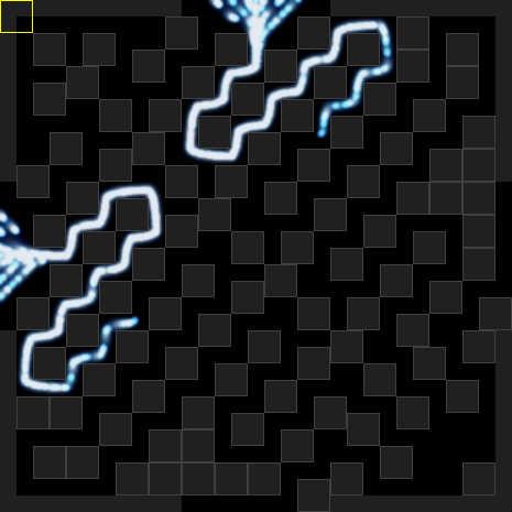 Layout Editor (for Dijkstra Particle Streams (Ver.1.1)) で作成した例です * http://wonderfl.net/code/425545196427ae8659973a8bfb13d54cfdeaf425 * ------------------------------------------------------------------ * [遊び方] * 右下の2つの出口をタイミングよく交互に開閉することで、 * パーティクルがゴールに辿り着くこと無く、長い迷路を永遠にさまよい続けるのです。 * ------------------------------------------------------------------ ------------------------------------------------------------------ * [更新内容] * ・パフォーマンスを犠牲して、パーティクルを奇麗にしてみた * ・パーティクルの軌跡を、滑らかに改善(+経路を塞ぐとフワフワ) * ・パーティクルが複数のゴール候補から最短のゴールに向かって進むようになった * ・微妙にコードの整理、微妙なバグを修正 * ------------------------------------------------------------------ * [いじりどころ] * 下の方にあるParameterクラスに簡単にいじれる値をまとめてあります。 * 是非、Forkしていろいろ試してみてください! * ------------------------------------------------------------------ * 後でレイアウトを編集するエディタを作る予定。 ------------------------------------------------------------------ * 最短経路を進むパーティクル * * [inspired by] * Desktop Tower Defense * http://www.handdrawngames.com/DesktopTD/ * Dijkstra Visualization * http://w