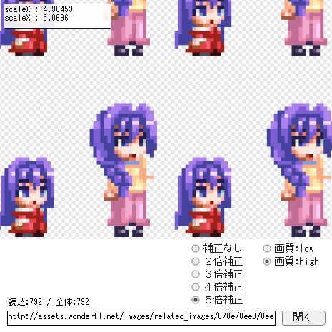 ------------------------------------------------- ローレゾなドット絵の拡大 マウスホイール回転で拡大縮小が可能です。 ニアレストネイバーで拡大するとくっきりしますがたゆみます。 バイリニアで拡大するとぼやけますがスムーズに拡大します。 ニアレストネイバーで整数倍拡大してからバイリニアで拡大すると くっきり感を得つつスムーズに拡大します。 -------------------------------------------------