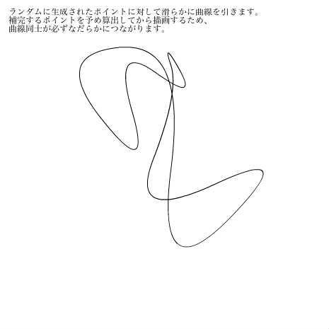 tex.text = 'ランダムに生成されたポイントに対して滑らかに曲線を引きます。\n補完するポイントを予め算出してから描画するため、\n曲線同士が必ずなだらかにつながります。';
