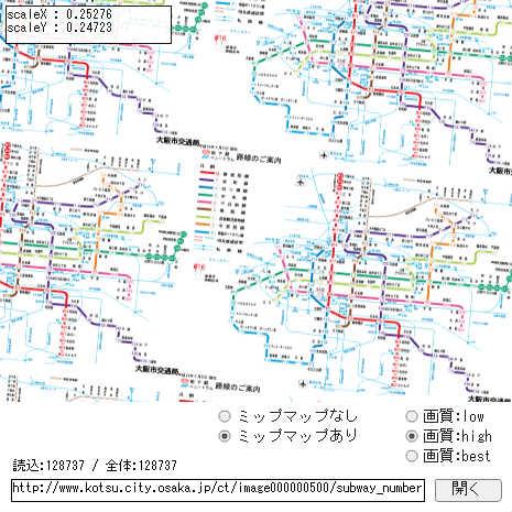 ------------------------------------------------- ミップマップでビットマップの縮小 画像は大阪市交通局から勝手にお借りしてます。 100%より小さく、少しずつ姿勢を変化させ続けたときに ビットマップがどのように描画されるかを確認するテストです。 マウスホイール回転で拡大縮小が可能です。 -------------------------------------------------