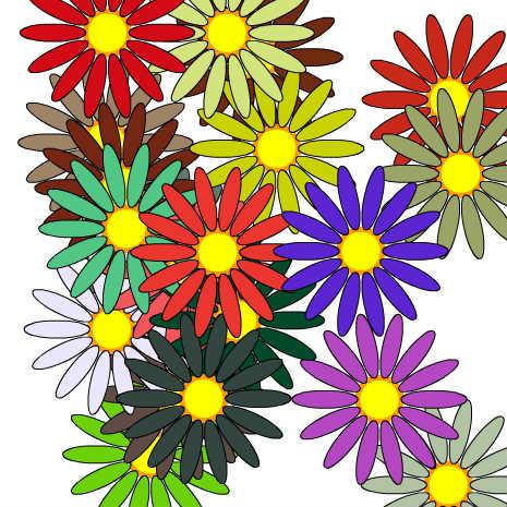 花の中心の円をSpriteインスタンスのflowerとして、そこに花びらを角度をつけてくっつけていきました。花びらを表すShapeインスタンスをpetalとして楕円で作成しましたが、そのままだと基準点が左上隅なので、回転や移動がうまくできません。そこでSpriteインスタンスのbaseを作成し、そこにpetalをズラして置き、baseの方を移動・回転させました。 花を20個ランダムにstage上に置きました。