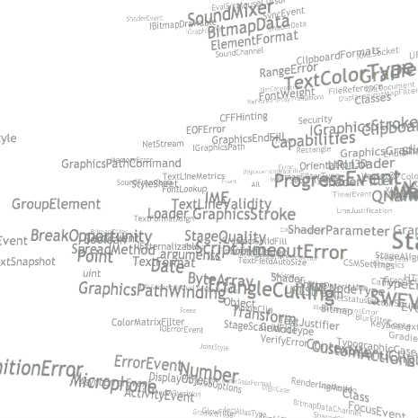 private var tagsString:String ="All Classes Accessibility AccessibilityProperties ActionScriptVersion ActivityEvent AntiAliasType ApplicationDomain ArgumentError arguments Array AsyncErrorEvent AVM1Movie BevelFilter Bitmap BitmapData BitmapDataChannel BitmapFilter BitmapFilterQuality BitmapFilterType BlendMode BlurFilter Boolean BreakOpportunity ByteArray Camera Capabilities CapsStyle CFFHinting Class Clipboard ClipboardFormats ClipboardTransferMode ColorCorrection ColorCorrectionSupport ColorMatrixFilter ColorTransform ContentElement ContextMenu ContextMenuBuiltInItems ContextMenuClipboardItems ContextMenuEvent ContextMenuItem ConvolutionFilter CSMSettings CustomActions DataEvent Date DefinitionError Dictionary DigitCase DigitWidth DisplacementMapFilter DisplacementMapFilterMode DisplayObject DisplayObjectContainer DropShadowFilter EastAsianJustifier ElementFormat Endian EOFError Error ErrorEvent EvalError Event EventDispatcher EventPhase ExternalInterface FileFilter FileReference FileReferenceList FocusEvent Font FontDescription FontLookup FontMetrics FontPosture FontStyle FontType FontWeight FrameLabel FullScreenEvent Function GlowFilter GradientBevelFilter GradientGlowFilter GradientType GraphicElement Graphics GraphicsBitmapFill GraphicsEndFill GraphicsGradientFill GraphicsPath GraphicsPathCommand GraphicsPathWinding GraphicsShaderFill GraphicsSolidFill GraphicsStroke GraphicsTrianglePath GridFitType GroupElement HTTPStatusEvent IBitmapDrawable ID3Info IDataInput IDataOutput IDrawCommand IDynamicPropertyOutput IDynamicPropertyWriter IEventDispatcher IExternalizable IGraphicsData IGraphicsFill IGraphicsPath IGraphicsStroke IllegalOperationError IME IMEConversionMode IMEEvent int InteractiveObject InterpolationMethod InvalidSWFError IOError IOErrorEvent JointStyle JPEGLoaderContext JustificationStyle Kerning Keyboard KeyboardEvent KeyLocation LigatureLevel LineJustification LineScaleMode Loader LoaderContext LoaderInfo LocalConnection Math Matrix Matrix3D MemoryError Microphone MorphShape Mouse MouseCursor MouseEvent MovieClip Namespace NetConnection NetStatusEvent NetStream NetStreamInfo NetStreamPlayOptions NetStreamPlayTransitions Number Object ObjectEncoding Orientation3D PerspectiveProjection PixelSnapping Point PrintJob PrintJobOptions PrintJobOrientation ProgressEvent Proxy QName RangeError Rectangle ReferenceError RegExp RenderingMode Responder SampleDataEvent Scene ScriptTimeoutError Security SecurityDomain SecurityError SecurityErrorEvent SecurityPanel Shader ShaderData ShaderEvent ShaderFilter ShaderInput ShaderJob ShaderParameter ShaderParameterType ShaderPrecision Shape SharedObject SharedObjectFlushStatus SimpleButton Socket Sound SoundChannel SoundCodec SoundLoaderContext SoundMixer SoundTransform SpaceJustifier SpreadMethod Sprite StackOverflowError Stage StageAlign StageDisplayState StageQuality StageScaleMode StaticText StatusEvent String StyleSheet SWFVersion SyncEvent SyntaxError System TabAlignment TabStop TextBaseline TextBlock TextColorType TextDisplayMode TextElement TextEvent TextField TextFieldAutoSize TextFieldType TextFormat TextFormatAlign TextJustifier TextLine TextLineCreationResult TextLineMetrics TextLineMirrorRegion TextLineValidity TextRenderer TextRotation TextSnapshot Timer TimerEvent Transform TriangleCulling TypeError TypographicCase uint URIError URLLoader URLLoaderDataFormat URLRequest URLRequestHeader URLRequestMethod URLStream URLVariables Utils3D Vector Vector3D VerifyError Video XML XMLDocument XMLList XMLNode XMLNodeType XMLSocket XMLUI";