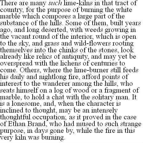 static private const s3:String = " lime-kilns in that tract of country, for the purpose of burning the white marble which composes a large part of the substance of the hills. Some of them, built years ago, and long deserted, with weeds growing in the vacant round of the interior, which is open to the sky, and grass and wild-flowers rooting themselves into the chinks of the stones, look already like relics of antiquity, and may yet be overspread with the lichens of centuries to come. Others, where the lime-burner still feeds his daily and nightlong fire, afford points of interest to the wanderer among the hills, who seats himself on a log of wood or a fragment of marble, to hold a chat with the solitary man. It is a lonesome, and, when the character is inclined to thought, may be an intensely thoughtful occupation; as it proved in the case of Ethan Brand, who had mused to such strange purpose, in days gone by, while the fire in this very kiln was burning.";