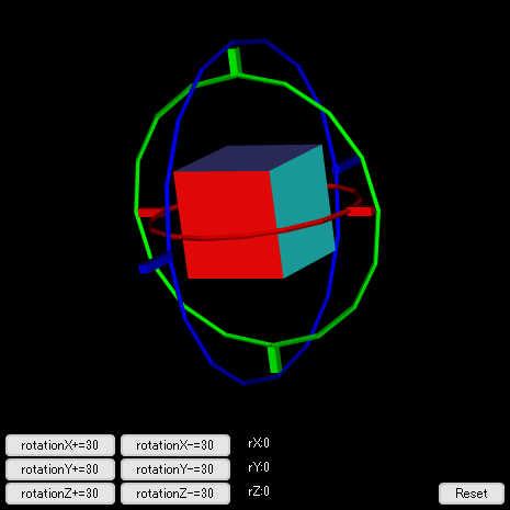 2.「rotationZ+=30」をクリックしてみる。Z軸回転したことを確認。