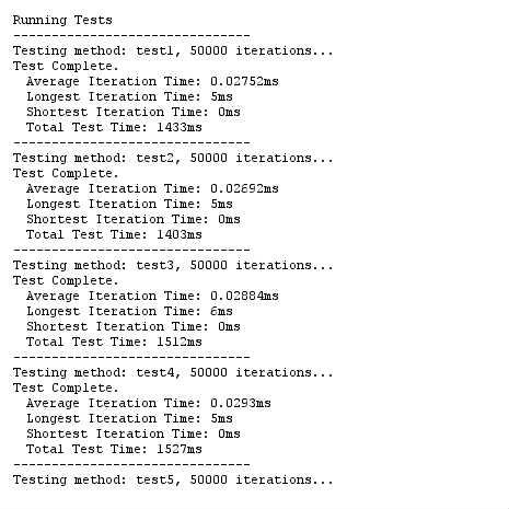 output("Testing method: " + methodName + ", " + iterations + " iterations...");