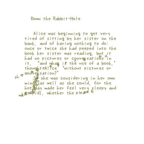 + "\n So she was considering in her own mind (as well as she could, for the hot day made her feel very sleepy and stupid), whether the pleasure of making a daisy-chain would be worth the trouble of getting up and picking the daisies, when suddenly a White Rabbit with pink eyes ran close by her.";