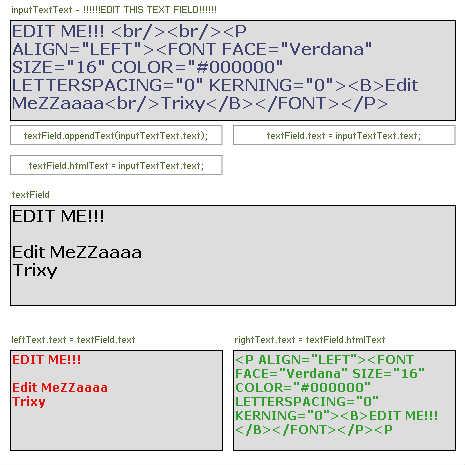 inputText.text = 'EDIT ME!!! <br/><br/><P ALIGN="LEFT"><FONT FACE="Verdana" SIZE="16" COLOR="#000000" LETTERSPACING="0" KERNING="0"><B>Edit MeZZaaaa<br/>Trixy</B></FONT></P>';