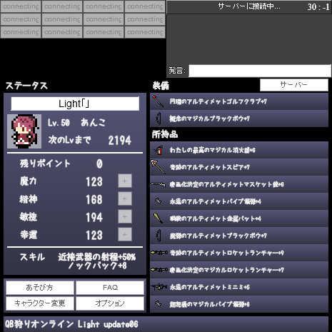 本家(http://wonderfl.net/c/3VrR)が完全復活するまでの繋ぎにどうぞ ※本家クライアントが遊んでる鯖と同じ鯖に繋がない ※本家のセーブデータ持ち込みOK、持ち出しはやめとけ [update05] コードのベースをサーバー指定版2011-11-20版に変更 (http://wonderfl.net/c/2wac) wave51開始部屋の猶予時間を15秒→20秒に延長 SOSボタンを追加。押すとチャットに救援要請します [ウリ] QBの湧き数を削減 それに伴い敵強さとか経験値とかスコアとか調整 wave99まで実装 wave51から始まる部屋実装(世界9~12、開始20秒は湧き無し) まどか、さやか、ほむらのスキルちょっと強化 wave中に一度もQBを通さなかった場合、waveが2上昇 [既知のバグ 依然原因不明] Firefox以外のブラウザだとIMEがONにならない