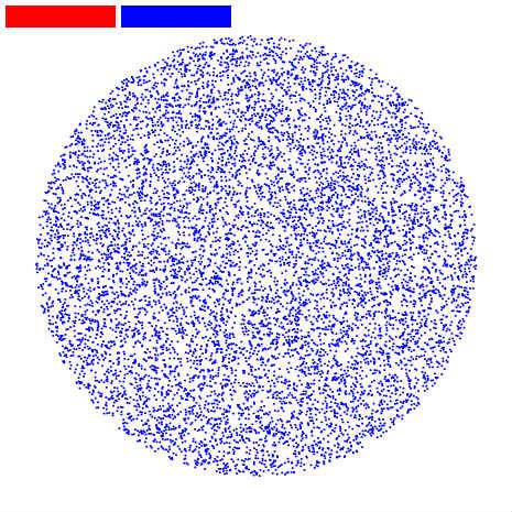 そこで、XとYでランダムに配置。半径内にないものは再配置してみると、視覚的にはよりランダムに配置できました。(青色配置)