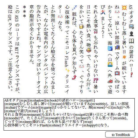 inputTF.text = "ASオタク[m:pc][m:shadow][m:book]の諸君ハロー[m:sign01]\n[m:impact]むしむし蒸し暑い日[m:sun]が続いていますね[m:wobbly]。涼しい部屋[m:chair]でゲーム[m:tv][m:game]ばっかりしてないで、海[m:wave]へ山[m:fuji]へ外[m:shoe]で遊び[m:run]ましょう!\nそれと食事[m:restaurant]も忘れちゃいけない[m:sign02]暑い日にこそ熱い食べ物[m:noodle]で、たくさん汗[m:sweat01]をかいて[m:beer]たくさん笑って[m:smile]、ぐっすり[m:sleepy]眠れば、心も体も夏バテ知らず[m:up]\n心技体揃ってこそコレFlash[m:shine]クリエイター[m:happy01]なり。\nとか無理してたくさん絵文字を使ってみましたが、なんか電車内のレンタルパレットの広告みたいですよね。ヤングっぽいケータイ文章の勘所が全くわかりません。\n***\nこのAS3のコードはMITライセンスですが、絵はGPLライセンスです。ご注意ください。";
